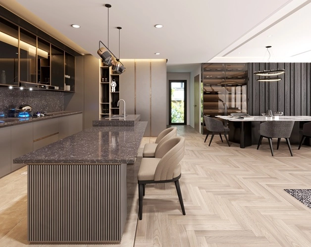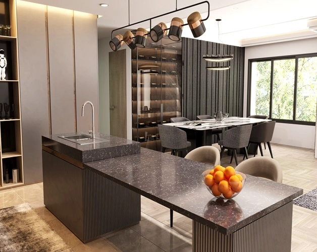 Vicostone Altissimo BQ8614 nổi bật với những đường vân nhỏ trắng mỏng, mềm mại trải dài khắp nền đá đen giống như những sợi xích ma, kết nối các thiên hà trong vũ trụ.