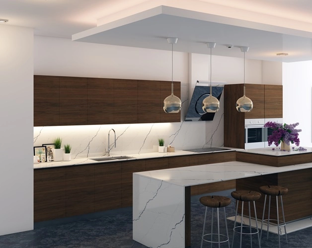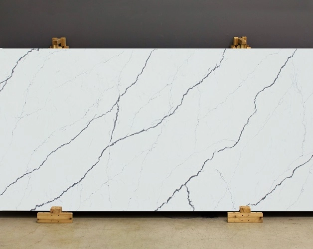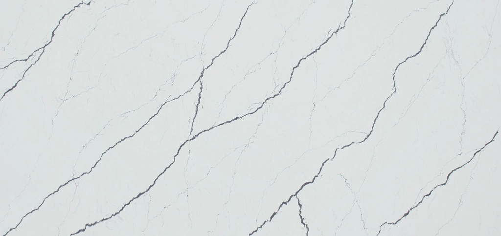 Sản phẩm đá Vicostone Greylac nổi bật với những đường vân rạn, như những tia sét đánh mạnh mẽ trải dài toàn tấm. Các đường vân xám đậm màu càng trở nên nổi bật hơn trên bề mặt mô phỏng hiệu ứng cẩm thạch trắng sáng.