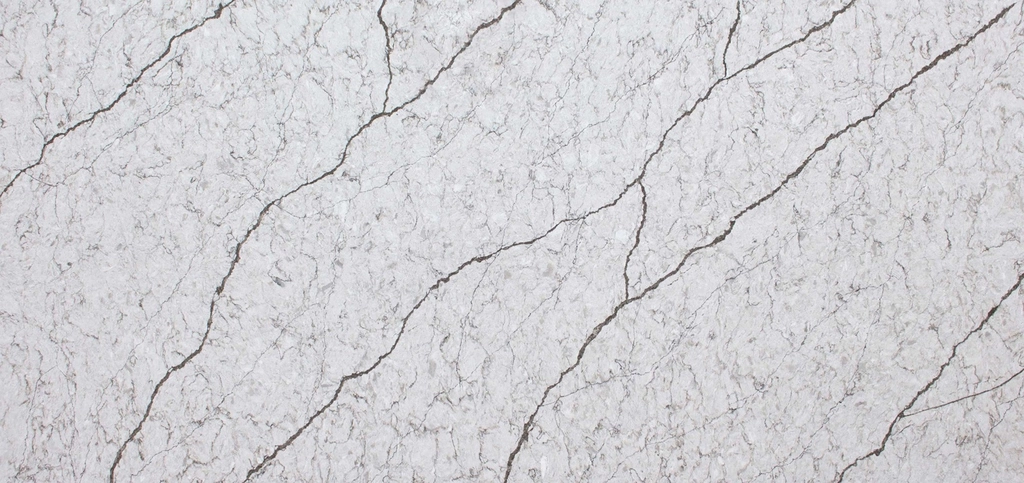 Sản phẩm đá Vicostone Diamante nổi bật với những đường vân rạn, như những tia sét đánh mạnh mẽ trải dài toàn tấm. Các đường vân này càng trở nên nổi bật hơn trên bề mặt mô phỏng hiệu ứng tương tự granite (granite-looking) màu trắng phóng khoáng.