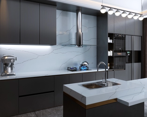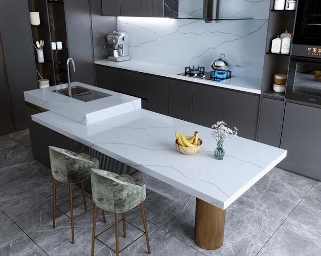 Đường vân thanh thoát màu xám đậm trải dài toàn tấm đá, kết hợp với những đường vân mảnh màu xám nhạt trên nền đá tựa cẩm thạch trắng muốt của VICOSTONE® Alessandria BQ8915 tái hiện những hang động kỳ vĩ trong lòng đại dương.
