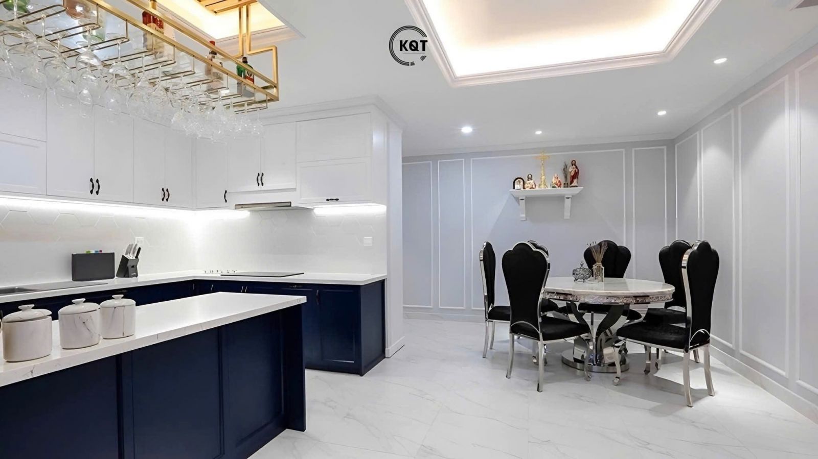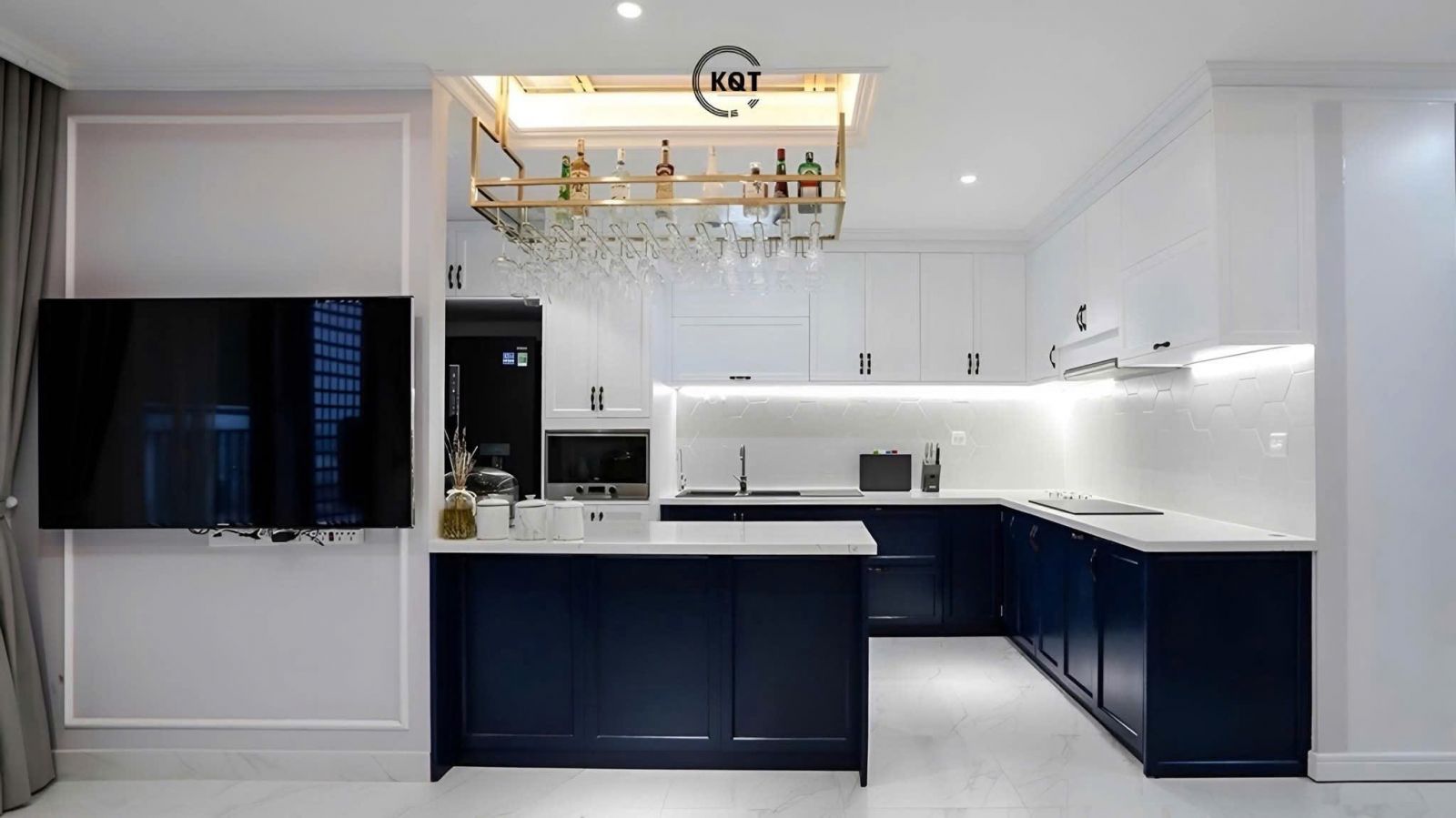 Không gian bếp hiện đại, sang trọng với tone xanh navy nổi bật - được hoàn thiện tỉ mỉ từ đá thạch anh nhân tạo cao cấp.