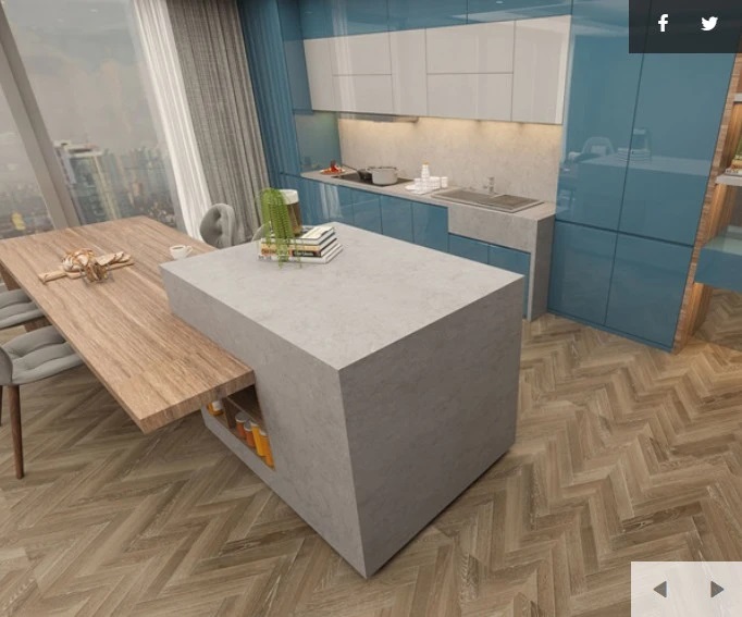 Lấy cảm hứng từ đá cẩm thạch tự nhiên, sản phẩm Vicostone Monterosa độc đáo với hiệu ứng vân rối màu tối xuất tiện trên bề mặt nền xám mạnh mẽ.