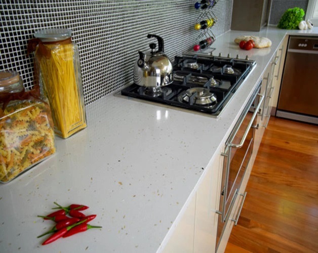 Sản phẩm đá Vicostone White Shells độc đáo với thiết kế sử dụng vỏ sò vỡ, tạo cảm giác trầm tích của biển xanh.