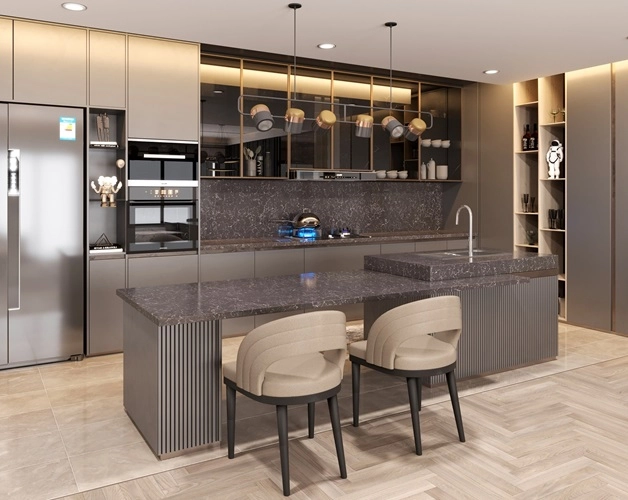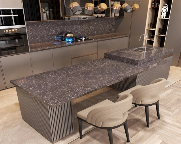 Vicostone Altissimo BQ8614 nổi bật với những đường vân nhỏ trắng mỏng, mềm mại trải dài khắp nền đá đen giống như những sợi xích ma, kết nối các thiên hà trong vũ trụ.