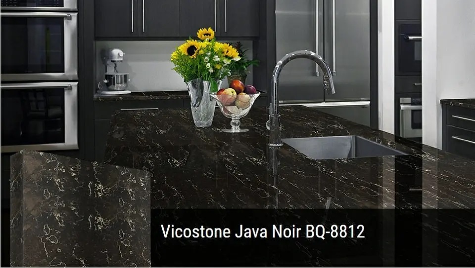 Sản phẩm đá Vicostone Java Noir được thiết kế bởi những đường vân trắng nhẹ, chạy tự do tạo nên sự tương phản rõ rệt trên nền tối với hai màu đen và nâu đậm.